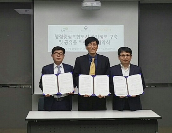행정중심복합도시건설청(청장 이충재)과 한국토지주택공사(사장 박상우, LH), 주식회사 카카오(대표이사 임지훈)는 20일 오후 2시 경기도 성남시 분당구 카카오 판교오피스에서 행정중심복합도시 공간정보 구축 및 공유를 위한 업무협약(MOU)을 체결했다고 밝혔다.