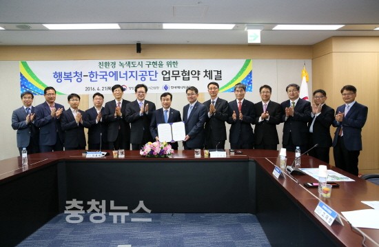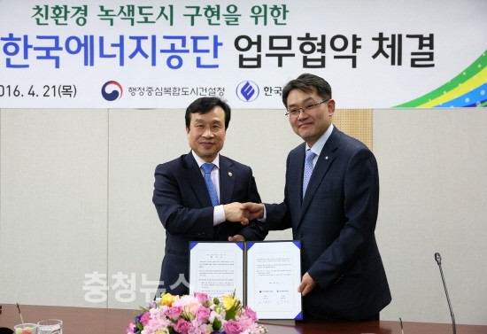 행정중심복합도시건설청(청장 이충재)은 한국에너지공단(이사장 변종립)과 21일 오후 2시 정부세종청사 행복청 종합사업관리상황실에서 업무협약(MOU)을 체결하고, 세계적 녹색도시 구현방안에 대한 설명회를 가졌다고 밝혔다.