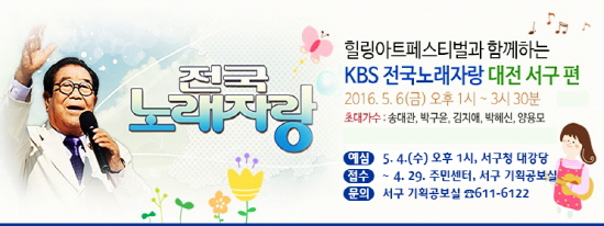 대전 서구(구청장 장종태)는 주민 화합과 ‘힐링아트 페스티벌’의 성공을 기원하기 위해 오는 5월 6일 서구청 옆 샘머리공원에서 ‘KBS 전국노래자랑’이 개최된다.