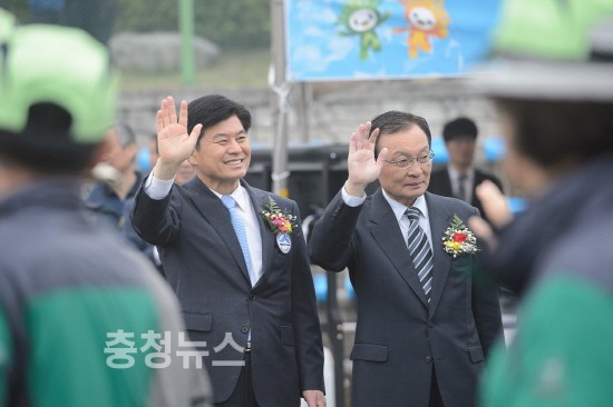 ▲ ‘제5회 세종시민 체육대회’참가자들의 입장에 손을 흔들고 있는 이춘희 시장과 무소속 이해찬 의원