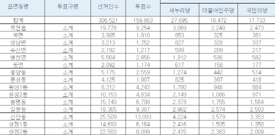 동(洞)별 정당투표 현황을 살펴보면 새누리당은 15개 동 지역 모든 곳에서 나머지 당을 압도하며 우위를 지켰다.