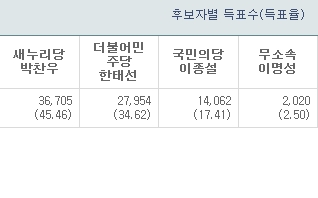 2일 동안 진행된 사전투표 현황을 살펴보면 더민주 한태선 후보가 2,795표를 얻어 1,950표를 얻은 박찬우 후보를 앞섰다.