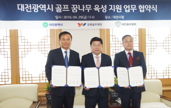 유원골프재단은 대전시(시장 권선택), 대전시골프협회(협회장 차만석)와 29일 대전시청에서 업무협약식을 갖고, 대전시 골프 꿈나무 육성지원 사업을 위해 상호 협력하기로 했다.