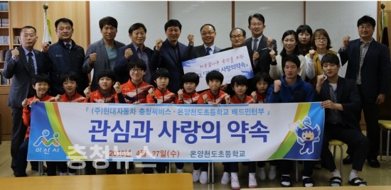 아산시(시장 복기왕)는 4월 27일 ㈜현대자동차 충청서비스(대표 김송)가 천도초등학교(교장 심장근) 배드민턴부에 3년간 지원을 약속하는 협약을 체결했다고 밝혔다.