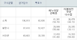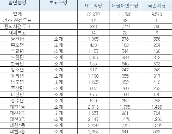 지역별로 살펴보면 보령지역에서 새누리당이 45.87%를 기록하며 높은 지지를 받았으며 서천군에서 39.89% 등 상대적으로 야권을 압도하는 모습을 보였다.