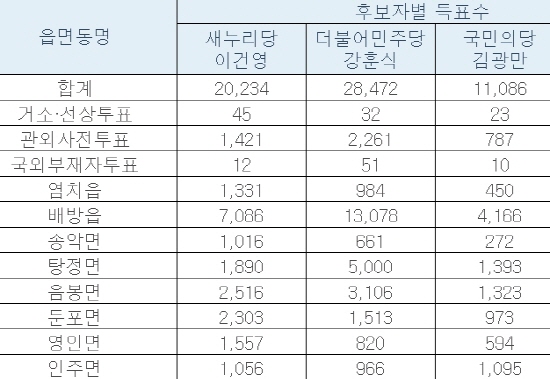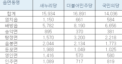 지역별로 살펴보면 더불어민주당은 인구가 가장 많은 배방읍을 비롯해 탕정면, 음봉면에서 앞섰으며 새누리당은 염치읍, 송악면, 둔표면, 영인면, 인주면에서 우위를 보였다.