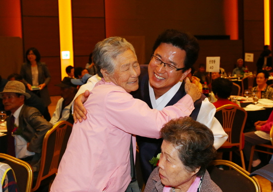 ▲ 허태정 구청장 어르신과 포옹하기 (사진제공- 유성구청)