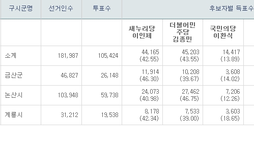 당일 투표에서는 이인제 의원이 금산과 계룡에서 김종민 후보를 압도하며 7선에 성공하는 듯 했으나 유권자수가 많은 논산지역에서 김종민 후보가 약 3천 표 이상 앞서는 결과를 보여주면서 불사조 이인제 의원을 꺾고 여의도 입성 티켓을 거머쥐었다.