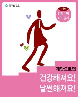 대전 중구(구청장 박용갑)는 생활터를 활용한 운동실천 환경조성과 구민의 삶의 질 향상을 위해 50여 공동주택 라인별 1층에 ‘계단이용 권장 표지판’을 부착해 계단오르기 생활화를 유도하고 있다고 11일 밝혔다.