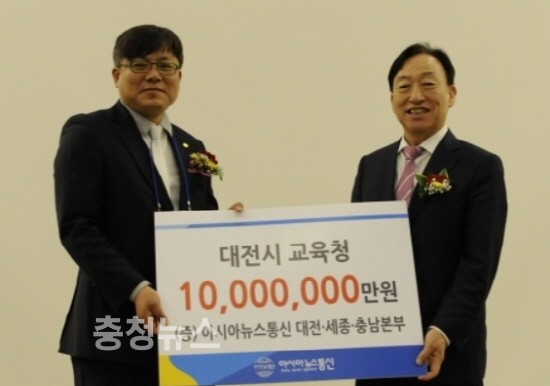 ▲ 박한복 대표가 설동호 대전시교육감에게 장학금을 전달하고 있다.(사진제공 아시아뉴스통신)
