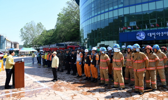 대전아쿠아리움에서 원인미상의 폭발에 의한 건물붕괴와 화재발생을 가상해 진행된 이번 훈련에서는 메시지 접수와 자위소방대 출동 및 초기 화재진압, 남부소방서 출동 및 구청·경찰·군부대 등이 출동해 유관기관별 임무를 물 흐르듯 완수했다.