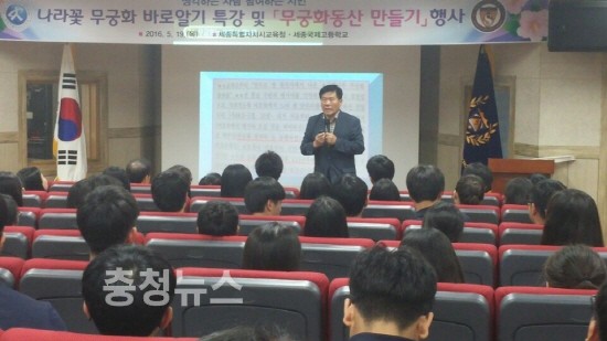 ▲ 박형순 회장이 세종국제고 학생들에게 나라꽃 무궁화를 올바로 이해하는 것의 중요성을 말하고 있다. / 충청뉴스 초형순 기자