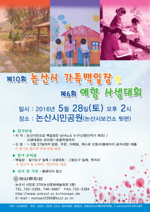 충남 논산문화원(원장 류제협)은 5월 28일 오후 2시, 논산시민공원에서 제10회 논산시 가족 백일장 및 제6회 애향사생대회를 개최한다고 밝혔다.