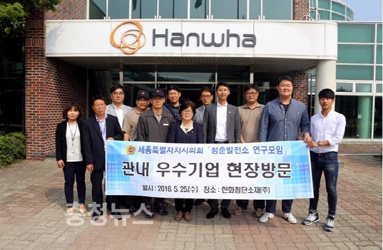 세종시의회 청춘발전소 연구모임(대표 : 이태환 의원)은 지난 25일(수) 관내 우수기업체인 한화첨단소재(주)(세종사업장장 강희준)를 방문해 업체대표 및 관계자와 청년일자리 창출 방안에 대해 토론하고 생산현장을 둘러보았다.