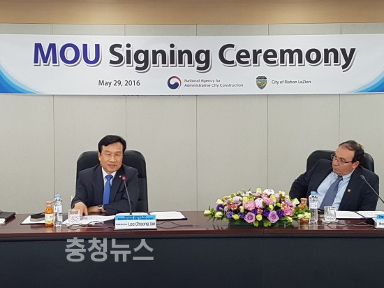 행정중심복합도시건설청(청장 이충재)은 29일 정부세종청사 행복청 종합사업관리상황실에서 이스라엘 리숀레지옹시(이하 리숀시)와 산학협력 및 투자유치, 신도시 개발 경험(노하우) 등의 교류를 위한 업무협약(MOU)을 체결했다고 30일 밝혔다.