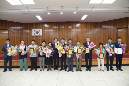한편 이날 6월 월례조회에는 지난5월 농업 기계화 및 국산화를 통해 해외시장 개척에 선두주자로 동탑산업훈장을 받은 (주) 지엠티의 윤여두 사장과 13세부터 허드렛일로 모은 자금을 종자돈 삼아 생선가게를 시작해 지난 2005년부터 최근까지 2억 원의 불우이웃돕기를 실천한 공로를 인정받아 제50회 청룡봉사상을 수상한 성물산의 이성래씨에게 훈장 전수식을 갖기도 했다.