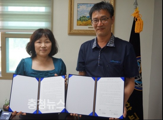 ▲ 박옥순 연세초등학교장(좌)과 변재성 세종더샵센트럴시티 관리소장(우)은‘주차장 공동 사용에 관한 업무협약’을 체결. / 충청뉴스 최형순 기자