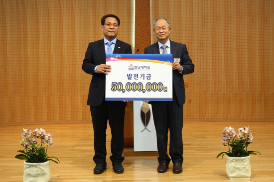 ▲ 이덕훈 한남대 총장(왼쪽)이 신동민 학사부총장(오른쪽)에게 발전기금 5천만 원을 기탁하고 있다.(사진제공- 한남대)