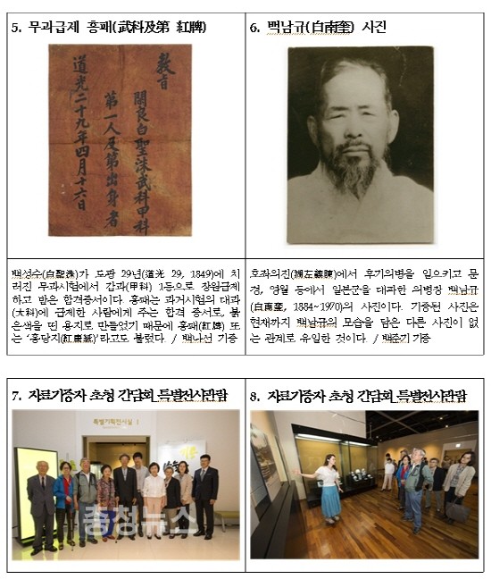 자료기증자 초청간담회에는 호좌의진(湖左義陳)에서 후기의병을 일으키고 문경, 영월 등에서 일본군을 대파한 의병장 백남규(白南奎, 1884~1970)의 모습을 담은 유일한 사진자료, ‘단성(檀聖)연호가 새겨진 막새기와’, 장안공립국민학교 졸업증서, 무과급제 홍패(武科及第 紅牌) 등의 자료를 기증해 주신 4명이 참석하여 기증자료 특별기획전을 빛내주었다.