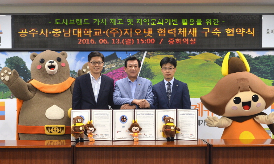 충남 공주시는 9일 오후 3시 공주시청 중회의실에서 오시덕 시장과 충남대학교 오덕성 총장, ㈜지오넷 오일택 대표 등 20여명이 참석한 가운데 도시브랜드 가치 제고 및 지역문화기반 활용을 위한 업무협약을 체결했다고 밝혔다.