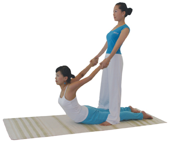 1┃한 명이 바닥에 이마를 대고 엎드리고, 짝은 엎드린 짝의 엉덩이 약간 아래쪽에 발을 두고 서서 서로 손이나 손목을 잡는다. 2┃서 있는 짝이 깊게 숨을 마시며 다리를 뻗어, 부드럽게 짝의 팔을 잡아당긴다. 엎드린 짝은 머리와 가슴을 불편하지 않을 정도로 들어올린다. 코브라가 되었다고 상상해 본다.3┃자세를 충분히 유지한 후 서 있는 짝이 숨을 내쉬면서 천천히 무릎을 구부리며 부드럽게 짝을 바닥에 내려놓는다. 완전히 바닥에 내려놓았을 때 손을 놓는다. 4┃잠시 쉰 다음 자리를 바꿔 자세를 되풀이 한다.