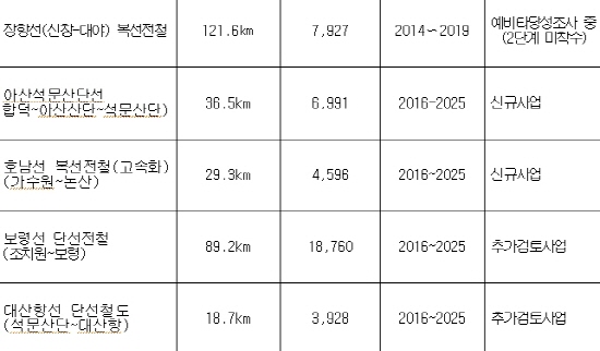 또 추가 검토사업으로 반영된 보령선(조치원∼공주∼청양∼부여∼보령)과 대산항선(석문산단∼대산항)은 지역발전 등 여건 변화를 면밀히 살펴 시행 가능한 수요발굴에 지속적으로 노력할 방침이다.