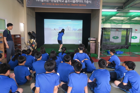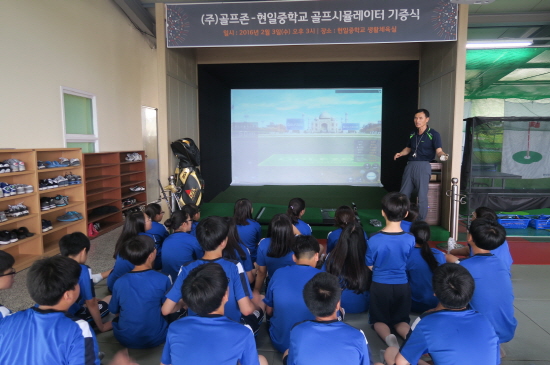 올해 1월, 골프존의 시뮬레이터 시스템을 기증받은 경북 구미 현일중학교 장상용 교장은 “우리 학교는 체육 수업은 물론 방과후수업에도 골프존 골프시뮬레이터를 적극 활용하고 있어 학생들이 골프를 친근한 스포츠로 받아들이고 있다”며 “한학기 동안 운용해본 결과 학생들의 수업 집중도도 높아지고 골프실력 향상까지 눈으로 확인할 수 있어 더욱 큰 보람을 느낀다”고 밝혔다.