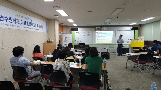 이번 연수원학교의 첫 시작은 미르초에서 맡았다. 지난 20일부터 24일까지 미르초에서 개설되는‘미르 혁신 이야기’라는 주제의 직무연수에는 관내 초등교원 45명의 연수생이 참여한다.