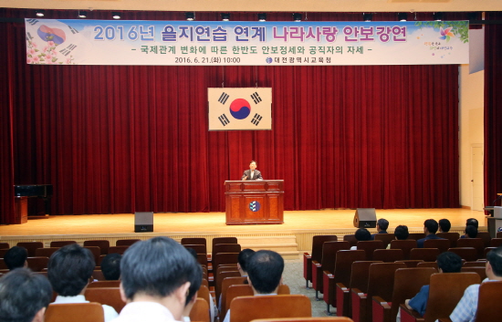 대전광역시교육청(교육감 설동호)은 21일(화) 오전 10시 대전시교육청 1층 대강당에서 전 직원을 대상으로 ‘2016년 을지연습 연계 나라사랑 공직자 안보강연회’를 개최하였다고 밝혔다.