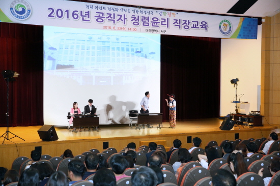 대전 서구(구청장 장종태)는 22일 구청 대강당에서 공직자의 청렴 의식 고취와 청렴 문화 확산을 위해 간부공무원과 500여명의 공직자를 대상으로 ‘2016년 공직자 청렴 윤리 직장교육’을 실시했다고 밝혔다.