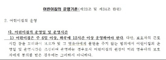 ‘맞춤형보육’대란을 근본적으로 해결할수 있는 손쉬운 방법이 있다. 우선 어린이집의 운영기준 2항의 다(어린이집의 운영일 및 운영시간 → 1) 어린이집은 주 6일 이상, 하루에 12시간 이상 운영하여야 한다.)를 근로기준법에 맞게 개정하면 가능하다.