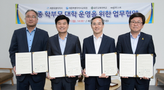 세종특별자치시(시장 이춘희)와 세종특별자치시교육청(교육감 최교진), 공주교육대학교(총장 안병근), 세종포스트(대표이사 이언구)가 27일 세종포스트 빌딩 5층에서 업무협약을 체결하고 9월부터 세종 학부모 대학을 공동으로 운영하기로 했다고 밝혔다.