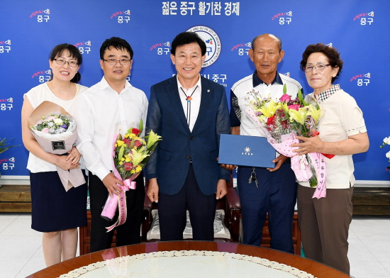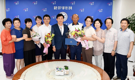 대전 중구 박용갑 청장은 29일 구청 구민사랑방에서 황교안 국무총리의 감사장과 다기세트를 류지현씨에게 전달하며 우리지역의 어려운 이웃을 위해 나눔을 펼치고 있음에 감사의 마음을 표했다.