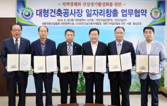 대전 서구 장종태 구청장은 30일 구청 다목적실에서 주안건설산업(주), 인덕건설(주), 대한전문건설협회 대전시지회, (사)대전건설 건축자재협회, 대한기계설비건설협회 대전시회와 「대형 건축공사장 일자리 창출」업무협약(MOU)을 체결했다고 밝혔다.