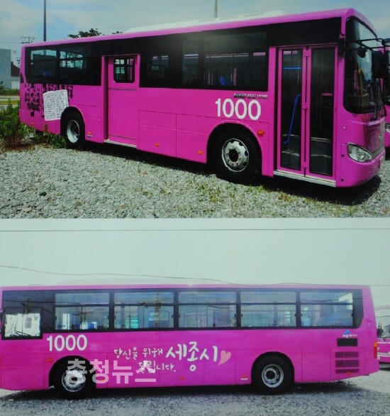 광역버스는 1000번으로 05:55부터 22:55까지 20분 간격으로 운행되고, 세종시 복사꽃에 가까운 연자주색 바탕에 세종대왕의 훈민정음으로 디자인하였다.