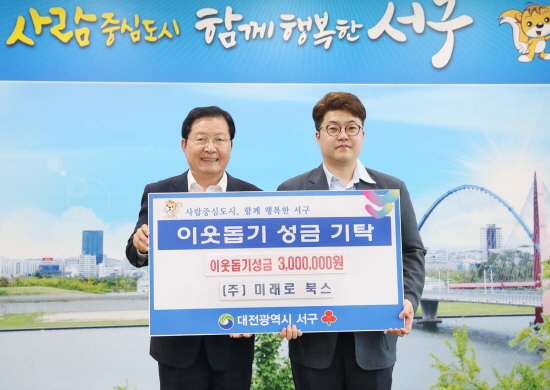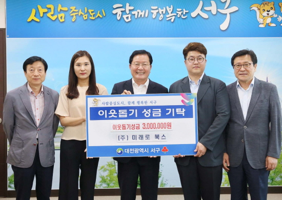 대전 서구(구청장 장종태)는 30일 구청 다목적실에서 ㈜미래로 북스(대표 윤형석)로부터 이웃돕기 성금 3백만원을 사회복지공동모금회를 통해 기탁받았다고 밝혔다.