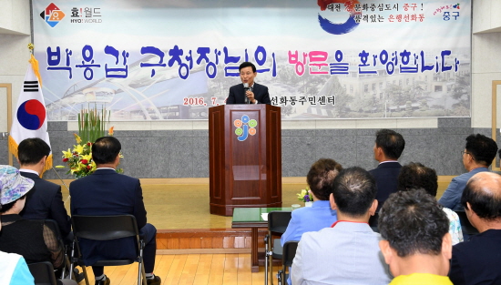 대전 중구 박용갑 청장은 4일 은행선화동주민센터를 시작으로 오는 14일까지 주민들의 생생한 의견과 애로사항을 청취하고 중구발전을 위한 비전을 공유하고자 구민과의 대화시간을 갖는다고 밝혔다.