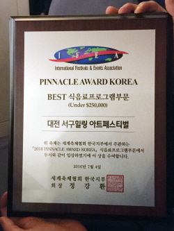 대전 서구(구청장 장종태)는 지난 4일 안산문화예술의전당 국제회의장에서 열린 ‘2016 피너클어워드 한국대회’에서 「서구 힐링 아트페스티벌」이 축제 개최 첫해에 수상하는 쾌거를 이뤘다고 밝혔다.