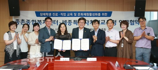 세종시교육청(교육감 최교진)이 6일 시교육청에서 세종특별자치시 종촌종합복지센터(센터장 이정수)와 양 기관의 관계자들이 참석한 가운데 장애학생 진로․직업교육 및 문화예술교육 활성화를 위한 상호협력 업무협약을 체결했다.