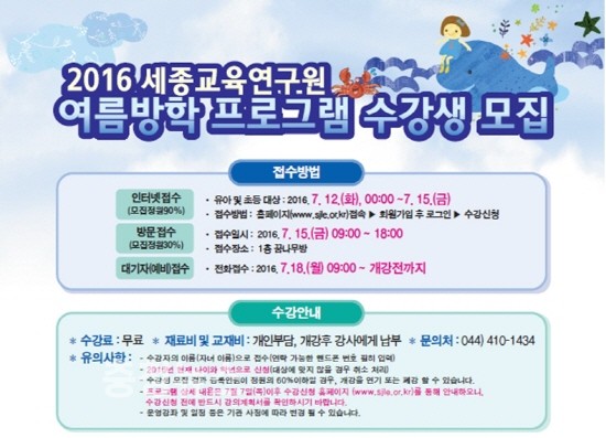 세종시교육연구원(원장 이현복)이 오는 20일을 전후로 시작되는 본격적인 여름방학을 맞아 어린이들이 도서관에서 즐겁고 보람된 시간을 보낼 수 있도록 오는 25일부터 내달 19일까지 여름방학 프로그램 및 독서교실을 운영한다.
