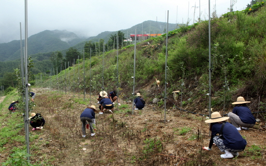 12명씩 10개조로 구성된 봉사단은 불볕의 날씨에도 불구하고 사과와 버섯 따기, 잡초 제거 등의 밭일과 도로청소 등 농민들의 일손을 돕기 위해 구슬땀을 쏟았다.