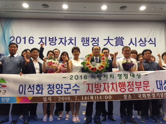 충남 청양군이 지방자치 21주년 및 민선6기 취임 2주년을 맞아 모범 지자체를 표창하는 2016 지방자치행정대상에서 지방자치행정부문 대상을 수상하는 영예를 안았다.
