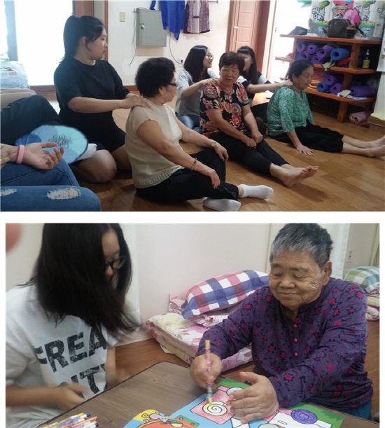 다음 동아리의 손길이 향한 곳은 중증장애와 연세가 많으신 어르신들이 대부분인 꽃동네사회복지재단에서 운영하는 행복의 집 노인요양원이었다. 이곳에서 학생들은 식사도우미, 야외 산책활동, 놀이활동, 시설정리 등의 활동을 나눠 했다.