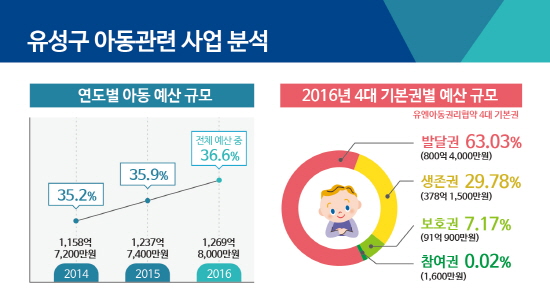 지난 3년간 유성구의 아동관련 예산의 규모는 ▲2014년 1,158억 7,200만원(전체예산 중 35.2%) ▲2015년 1,237억 7,400만원( “ 35.9%) ▲2016년 1,269억 8,000만원( ” 36.6%)로 꾸준한 증가를 보이고 있다.