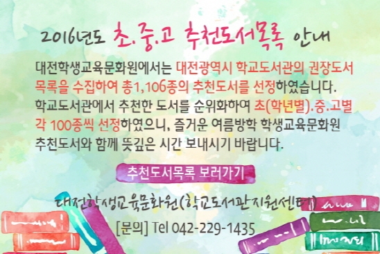 대전학생교육문화원(원장 박노일)이 여름 방학기간을 맞이해 “2016년도 초 ․ 중 ․ 고 추천도서목록”을 선정했다고 밝혔다.