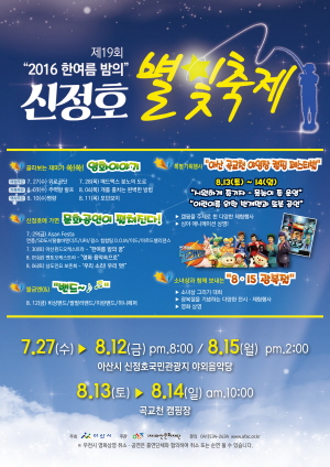 충남 아산시(시장 복기왕)는 무더운 여름밤 시민들에게 영화와 문화공연을 제공하는 ‘2016 한여름 밤의 신정호 별빛축제’를 아산문화재단 주관으로 이달 27일부터 8월 15일까지 신정호 야외음악당과 곡교천 야영장에서 개최한다고 밝혔다.