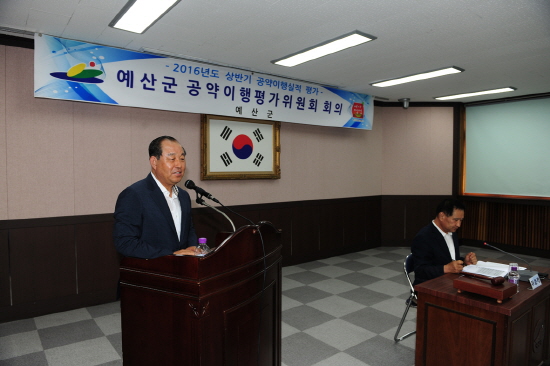 충남 예산군 공약이행평가위원회(위원장 이한두)가 26일 군청 제1회의실에서 전체회의를 갖고 민선 6기 군수 공약사업에 대한 올해 상반기 추진상황 평가결과를 발표했다고 밝혔다.