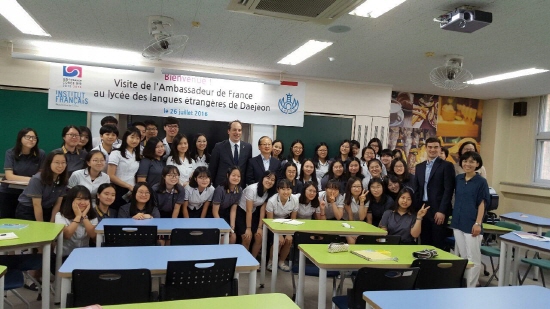 파비앙 페논(Fabien PENONE) 주한 프랑스 대사, 프랑스문화원장, 상무관, 프랑스어교육협력담당관 등이 지난 26일(화) 대전외국어고등학교를 방문했다. 주한 프랑스 대사의 대전외고 방문은 2014년에 이어 이번이 두 번째이다.