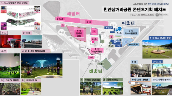 이날 보고회에서는 천안삼거리공원 내 △특별한 만남의 공간△해피엔딩의 화합과 긍정의 공간△모두가 공감하고 사랑하는 공간으로 스토리텔링해 천안을 상징하는 랜드마크로 조성한다는 구상을 밝혔다.