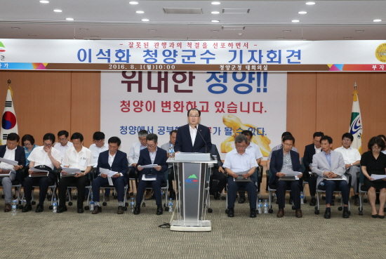 충남 이석화 청양군수가 최근 벌어진 8급 공무원 김모씨의 수억원 공금횡령사건에 대해 대 군민 사과를 하고 잘못된 행정관행 척결을 선포했다고 밝혔다.